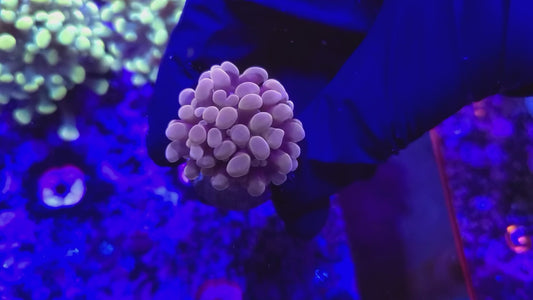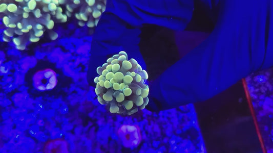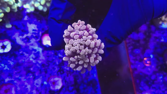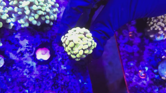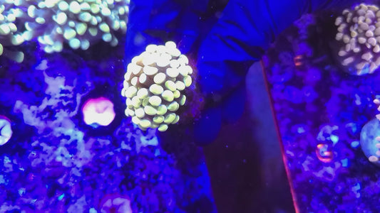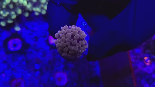 - Bubble Coral (Plerogyra sinuosa): Bubble coral is popular for its large exotic bulbous-shaped polyps that bunch together like a pile of bubbles, completely covering their corallites. These corals require gentle flow and moderate lighting, and their unique appearance makes them striking additions to reef displays.