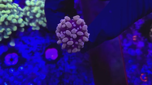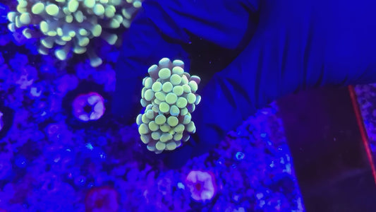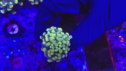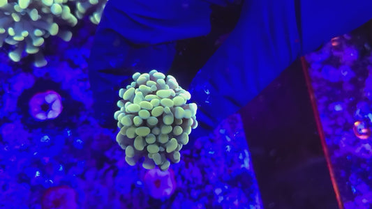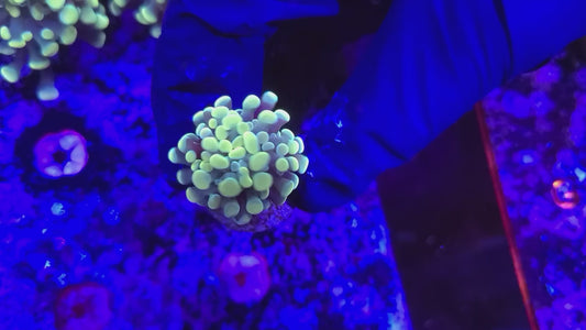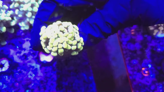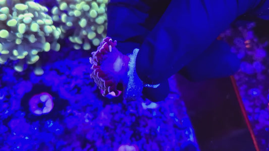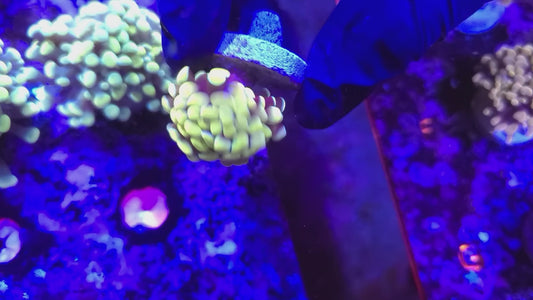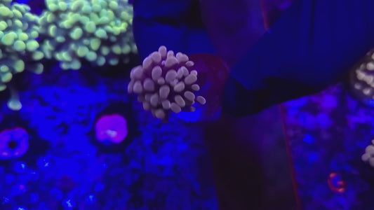 Target feeding with meaty foods like mysis shrimp, brine shrimp, chopped seafood, and specialized coral foods will promote growth and enhance coloration. Feed 2-3 times per week when polyps are extended, using a turkey baster or feeding tool to deliver food directly to individual polyps.