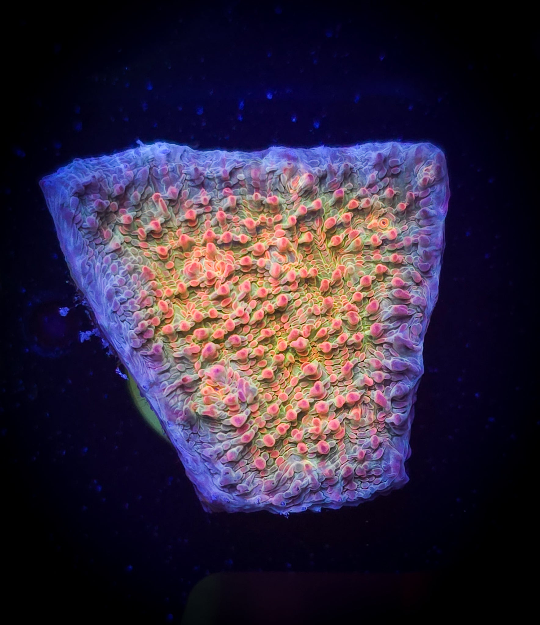Chalice form plates and comprise a wide range of corals including Echinopora, Oxypora, and Mycedium. Chalice are large polyp stony corals (LPS). What attracts many hobbyist to Chalice are their wide range of colors and patterns. They vary from one basic color to brilliant art pieces with many colors that can appear fluorescent and iridescent.