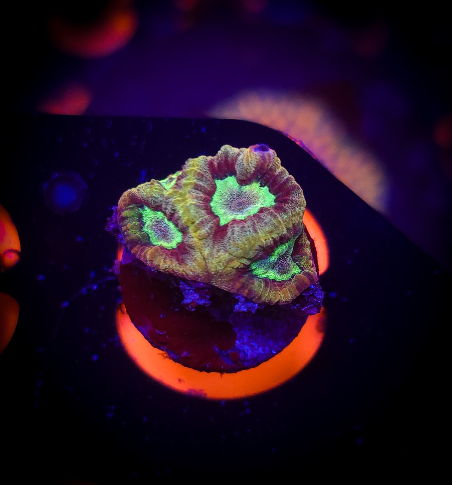 Favia is a large polyp stony (LPS) coral in the family Mussidae and are known as “brain coral” or “closed brain coral.” Favia are encrusting colonial coral that can be dome-shaped or flat, but variations occur. Favia have a grove between the two individual walls while a similar coral, Favites, have one fused or shared wall. Favia come in a wide variety, are reasonable growers and are pretty easy to keep making them good beginner coral. .