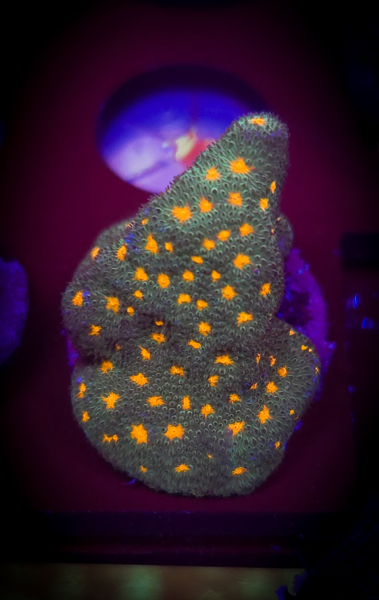 Porites is a small polyp stony (SPS) coral that had been assigned to the family Poritidae. They are mostly an encrusting coral and can grow into mounds. When the polyps are extended, they appear fuzzy. They are a moderate difficulty coral, similar to Acropora, but are on the easier end of the SPS corals. They can grow fast and large under good conditions.